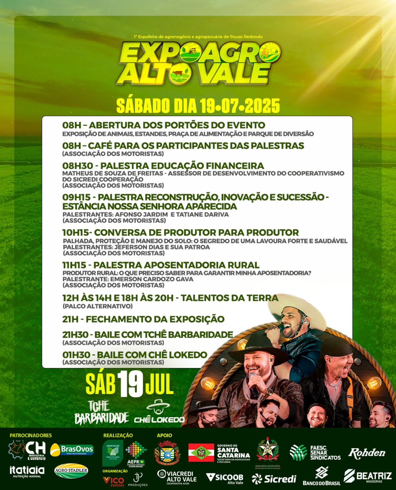 No sábado (19), os portões se abriram às 8h e o público acompanhou diversas palestras voltadas ao produtor rural, com destaque para temas como educação financeira, aposentadoria rural e manejo de solo. O dia termina com dois grandes shows: Tchê Barbaridade às 21h30 e Chê Lokedo à 1h30 da madrugada.