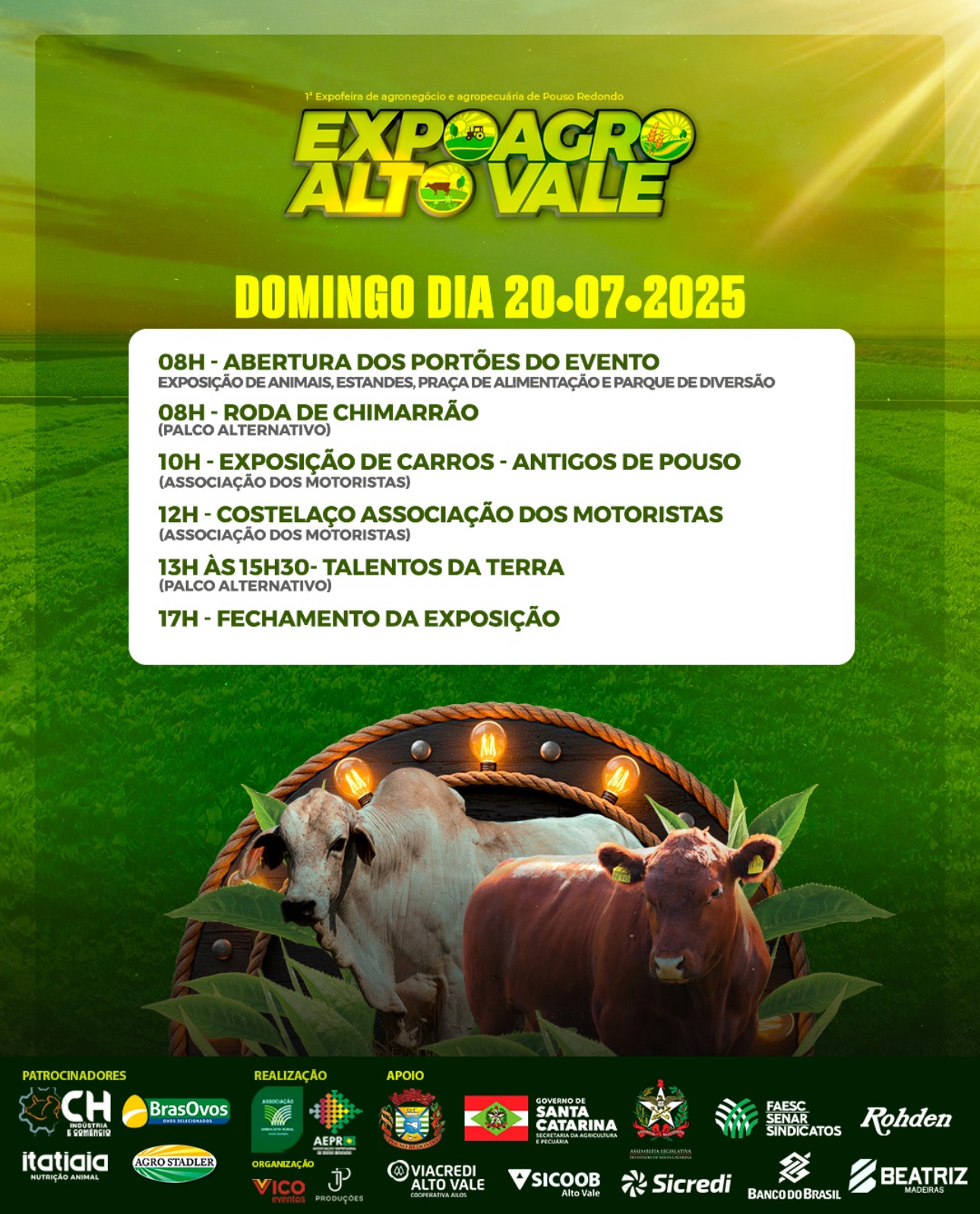 Já no domingo (20), a programação segue com a tradicional roda de chimarrão, exposição de carros antigos de Pouso Redondo, o tradicional costelão da Associação dos Motoristas e o encerramento com apresentações do projeto Talentos da Terra.