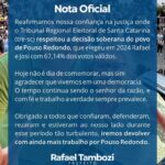 Em nota oficial, Rafael Tambozi agradeceu à população e ressaltou sua confiança na Justiça. Ele lembrou que sua chapa foi reeleita com 67,14% dos votos válidos.