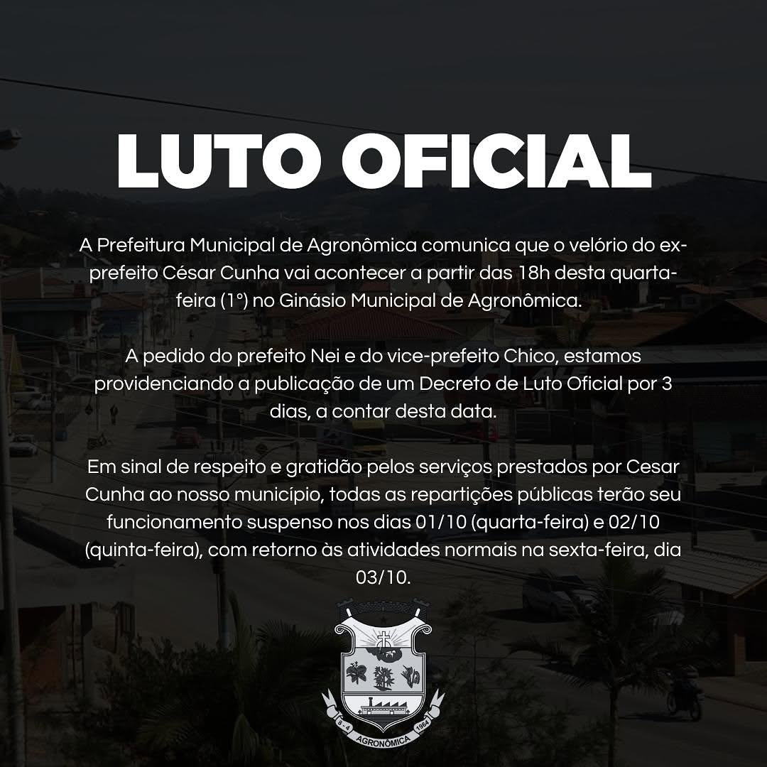 A Prefeitura de Agronômica decretou luto oficial de três dias pela morte do ex-prefeito Cesar Luiz Cunha, aos 65 anos. O velório ocorre a partir das 18h desta quarta-feira (1º), no Ginásio Municipal.