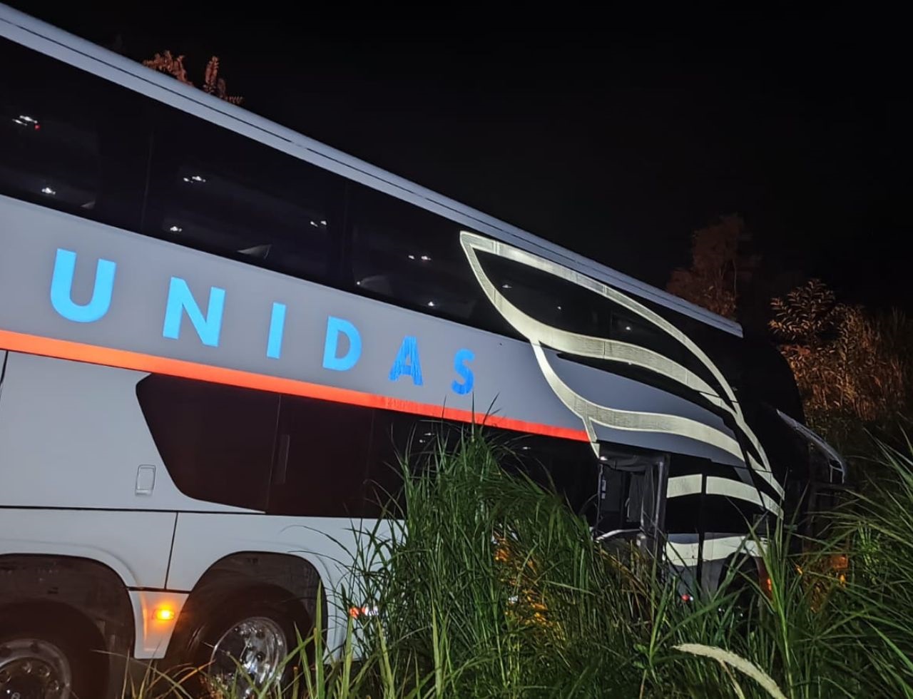 Na noite de domingo (23), um ônibus com 49 passageiros colidiu com um automóvel na BR-470, em Rodeio, e acabou saindo da pista junto com o carro. O acidente aconteceu por volta das 23h30, no Km 81 da rodovia.
