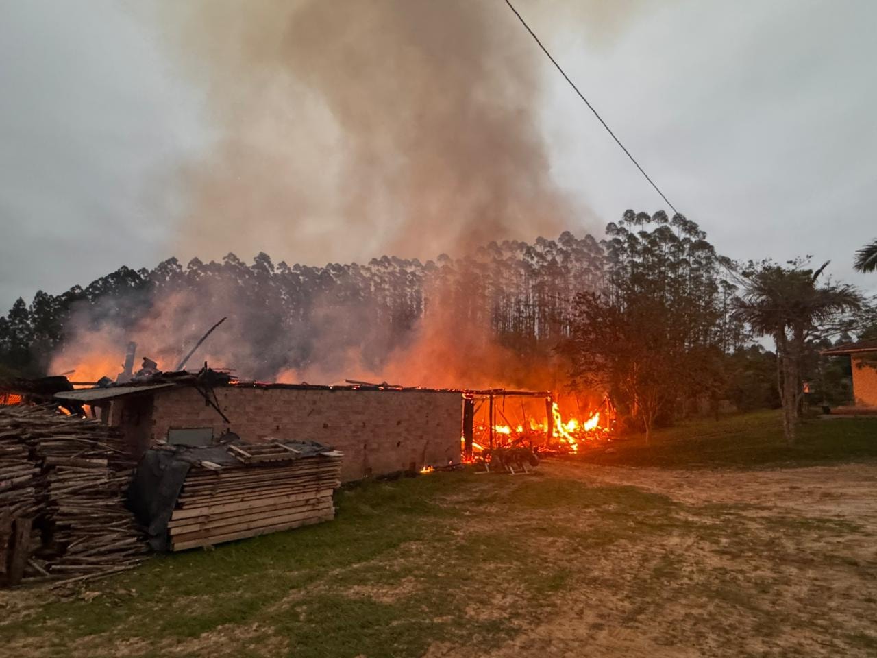 Um incêndio de grandes proporções destruiu uma estufa de secagem de tabaco na localidade de Alto Ribeirão Palmito, em Vitor Meireles, na madrugada desta quinta-feira (16). As chamas começaram por volta das 4h50 e se alastraram rapidamente, atingindo também um galpão, um trator e diversos implementos agrícolas.