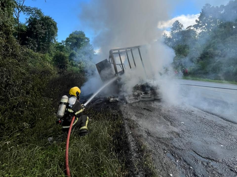 Um caminhão pegou fogo na manhã deste sábado na BR-470, em um trecho conhecido como Serra da Santa, em Pouso Redondo. Motoristas que passavam pelo local acionaram as equipes de emergência ao perceberem as chamas se espalhando rapidamente pelo veículo.