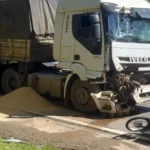De acordo com as informações iniciais, o impacto foi extremamente forte. A motocicleta ficou completamente destruída e parte da carga de um dos caminhões se espalhou sobre a pista.