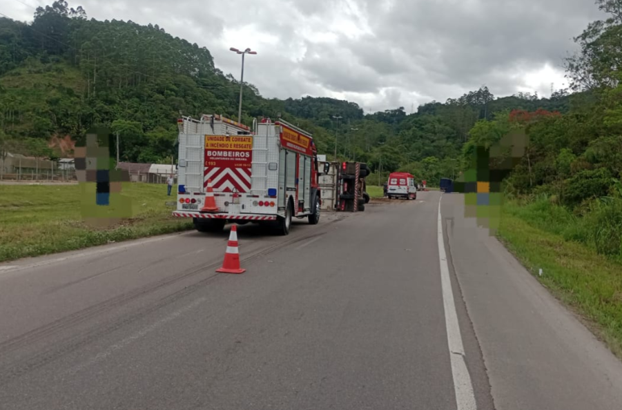 Uma carreta tombou na manhã desta segunda-feira (20) no km 118,5 da BR-470, próximo ao trevo do bairro Areado, em Ibirama. O acidente aconteceu por volta das 10h30 e mobilizou equipes do Corpo de Bombeiros Voluntários, do SAMU e da Polícia Rodoviária Federal (PRF).