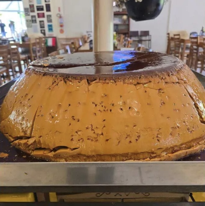 Um pudim com mais de 54 quilos virou atração em Videira, no Meio-Oeste catarinense, no último domingo (2). A criação é da cozinheira Márcia Dal Pizzol, proprietária do Restaurante Dal Pizzol, que decidiu transformar uma receita tradicional de família em uma sobremesa gigante — feita apenas com leite, ovos e leite condensado.