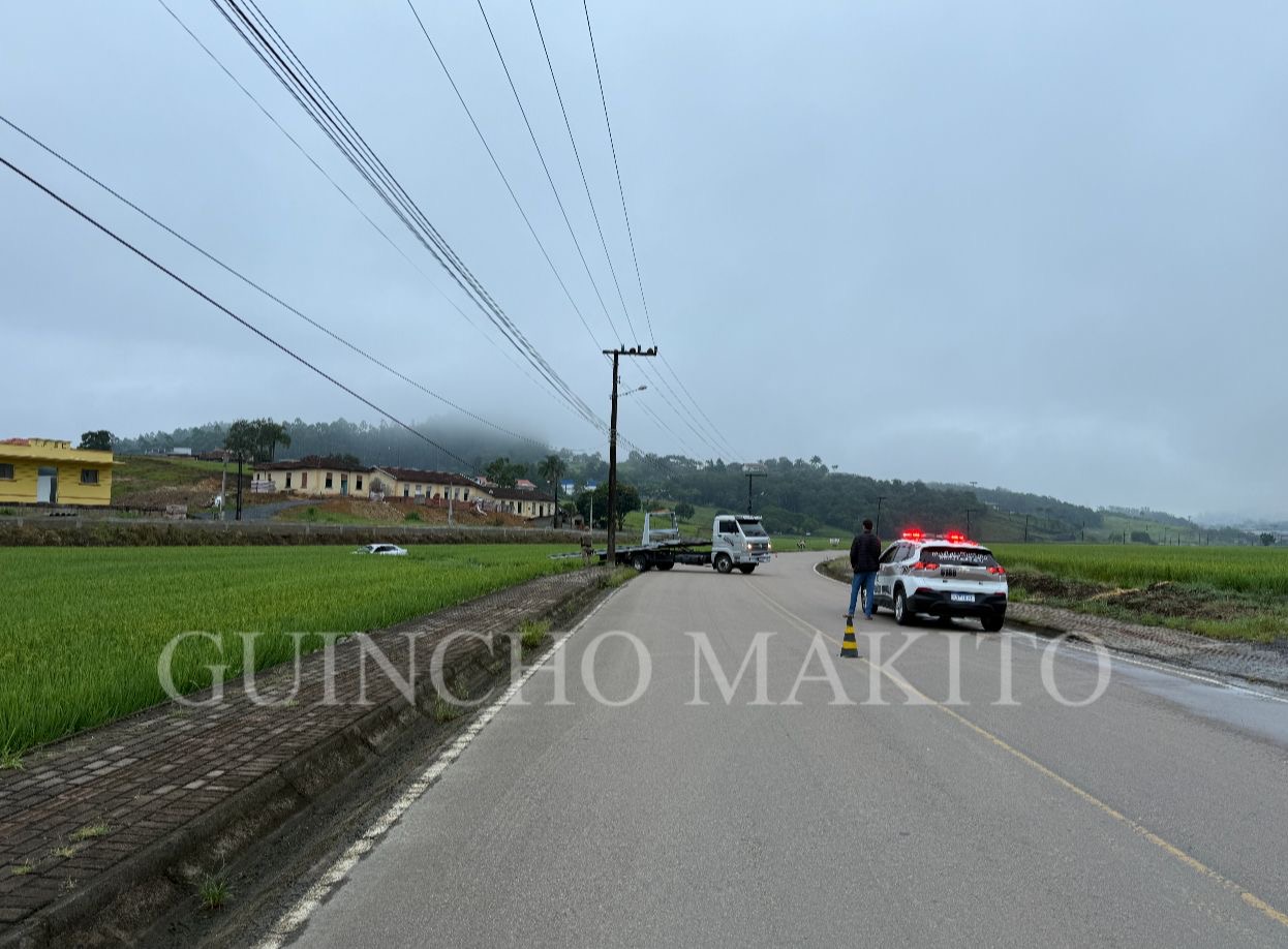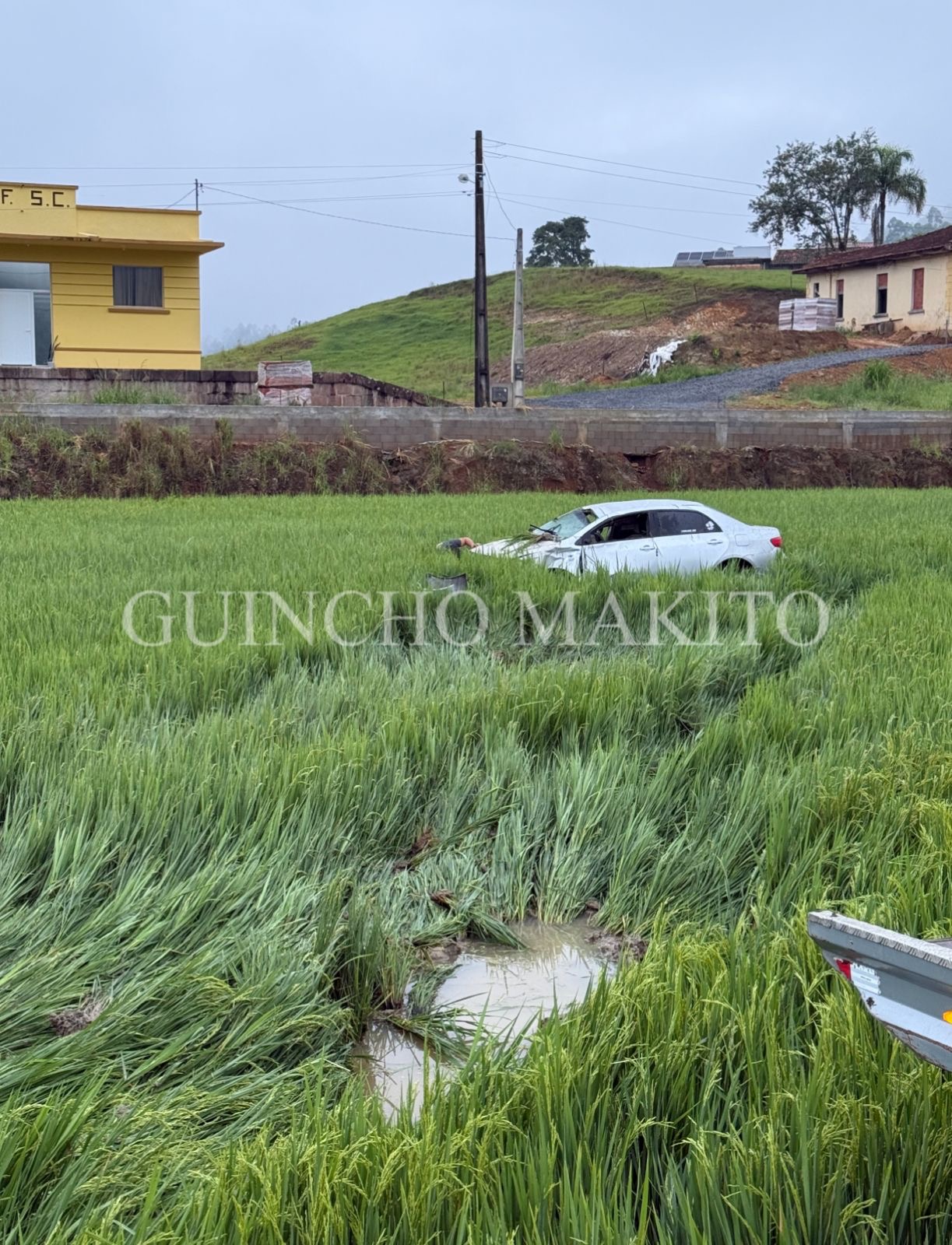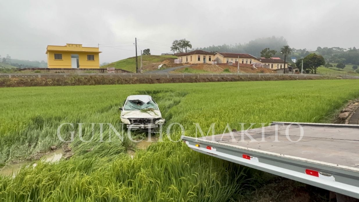 Um carro saiu da pista e acabou caindo em uma arrozeira, ficando parcialmente submerso. No veículo estava um casal, que recebeu atendimento no local e foi encaminhado ao Hospital Regional de Rio do Sul para avaliação médica.