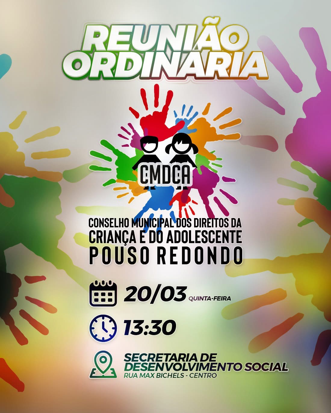 O Conselho Municipal dos Direitos da Criança e do Adolescente de Pouso Redondo (CMDCA) realizará sua segunda reunião ordinária de 2025 nesta quinta-feira, 20, às 13h30. O encontro acontecerá na Secretaria de Desenvolvimento Social e Habitação, na Rua Max Bichels, no Centro.