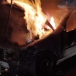 Um carro ficou completamente destruído após pegar fogo na madrugada desta segunda-feira (20), no bairro Barragem, em Rio do Sul, nas proximidades da Ponte Pênsil.